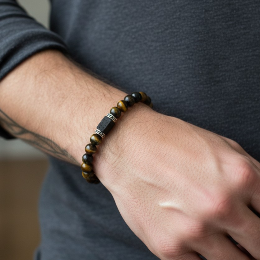 Bransoletka męska z tygrysiego oka i turmalinu wykończona elementami ze srebra pr. 925.