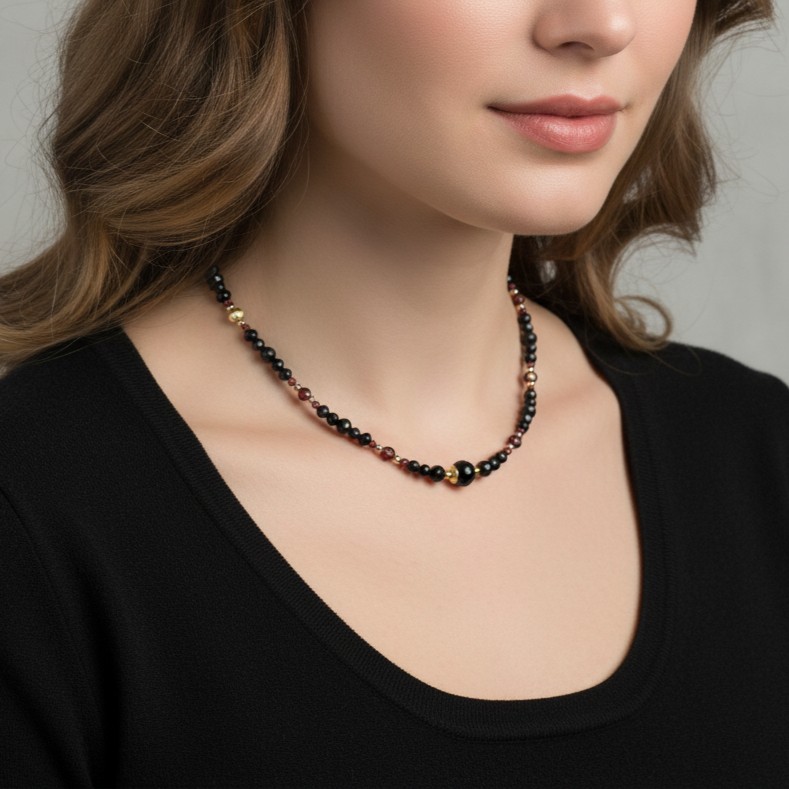 Naszyjnik z czarnego turmalinu i granatów – luksusowa biżuteria od polskiej marki NovOna